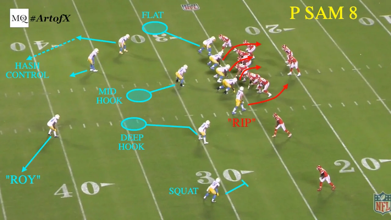 If you want to get into a base 3-4 spacing, you need to take an ILB off (instead of taking the SAM LB off for the nickel) in a “Penny” front, diagrammed above by